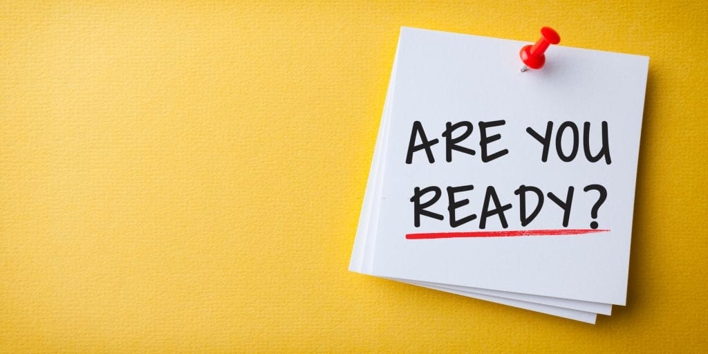 White Sticky Note With Are You Ready? And Red Push Pin On Cork Board